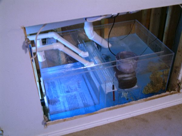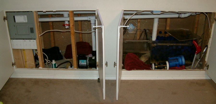 As you can see, towels are always handy to soak up excess water. The old sump held 37g to the top, and had to be run rather low to avoid a mess when the main pump is off. Prior to the installation of the new sumps, the plumbing was redone, and an electrician installed the sub-panel on the left.