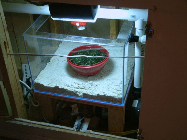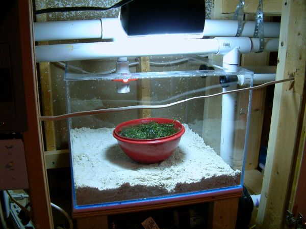 All the refugium needed was 20g of saltwater, which wasn't ready when I took this picture. Lighted with a 28w (output 200w) CF floodlight, macro algae should have no problems growing in this predatory-free environment. A ballvalve is visible above the bowl filled with caulerpa, and once opened will provide source water.