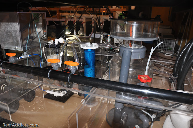 For nitrate and phoshpate control, I'm using a NextReef reactor. Model SMR1 XL, this reactor holds 2 liters of Vertex NP biopellets. Plumbed to the manifold, a ball valve is used to control the flow rate through the pellets. I've been running biopellets since February 6, 2011, and it appears to be working well: water-testing