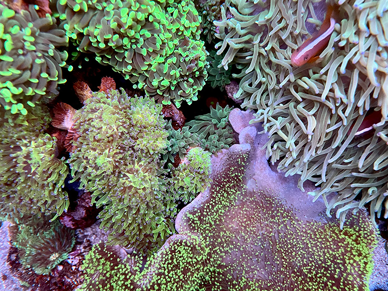 Every so often I get motivated to take a few pictures of my reef from above. Frankly, the best view is looking down into the aquarium from my perch on the walkboard. I took these pictures with my iPhone 12, using the Polyp Labs lenses in a Smartphone Floater.
