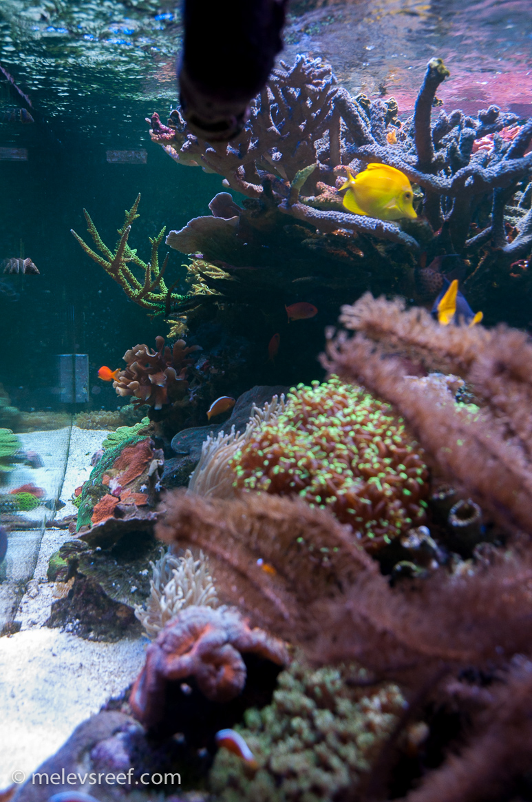 End view of the back half of the reef. Some of the Montipora table toward the back glass, but I can still run a cleaning magnet without hitting them. See Spock?