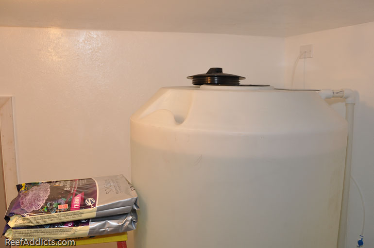 The external pump mixes up and keeps the saltwater in circulation until needed. Since the container is in the fishroom, the water temperature is close enough to the reef's temperature that water changes are easy. Opening a valve feeds new saltwater into the sump.