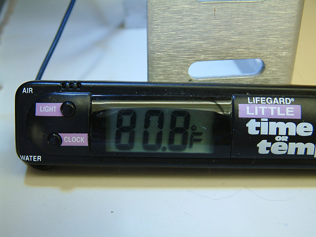 I installed a small computer fan (12v) behind the tank to cool the water slightly. It is connected to a 6v power supply. It is actually too efficient and cools the tank too much, so I turn it on for one hour or so, once the tank hits 81F.