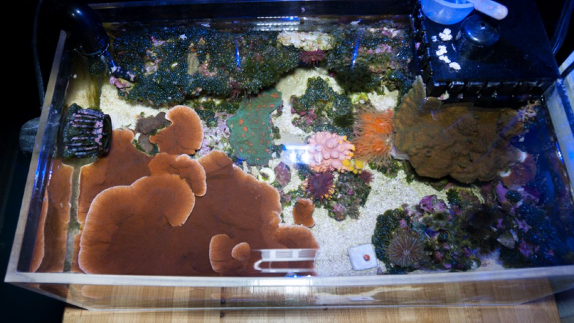 Unlike a traditional frag tank filled with corals to grow out and sell, mine is really a place to putter or enjoy new corals more readily. The tank is arranged with a variety of items, some easy to see, but there are some elusive critters that come out of hiding occasionally.